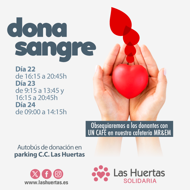 Del 22 al 24 de agosto, ven a donar sangre al autobús de donación que estará situado en el parking de Centro Comercial Las Huertas.