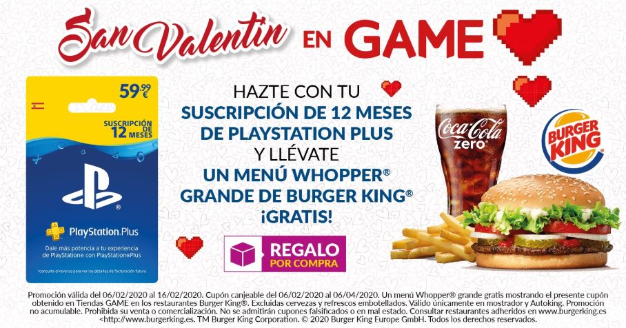 Ahora en Game con tu suscripción de 12 meses a PSPlus te llevas un Menú Whooper Grande de BurgerKing! Cupón canjeable del 06/02/2020 al 06/04/2020. Un menú whopper grande mostrando el presente cupón obtenido en Game. Excluidas cervezas y refrescos embotellados. Promoción no acumulable.