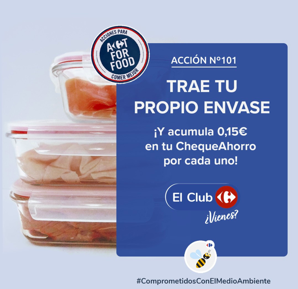 Ahora traer tu envase cuando compres productos frescos en los mostradores de nuestras tiendas es una de ellas. Acumula el 0,15€ en tu Cheque Ahorro por cada envase (máximo 3).