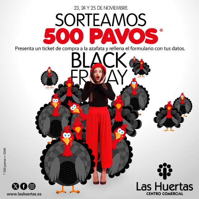 - La duración de la promoción es del 23 al 25 de noviembre de 2023. Los participantes de la promoción podrán ser todos los clientes del Centro Comercial Las Huertas mayores de 18 años. No tendrán consideración de Clientes y, por tanto, no podrán participar en el sorteo los empleados directos o indirectos del Centro Comercial Las Huertas, los arrendatarios o los cesionarios que presten sus servicios en el Centro Comercial Las Huertas. Así mismo, tampoco tendrán la consideración de Clientes los familiares en primer grado y parejas sentimentales de los empleados referidos.