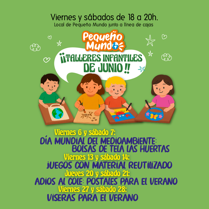 Durante todo el mes de junio, el espacio Pequeño Mundo acoge una divertida programación de talleres infantiles dirigidos a los más pequeños. Las actividades se desarrollarán cada viernes y sábado, de 18:00 a 20:00 horas, en el local situado junto a la línea de cajas.